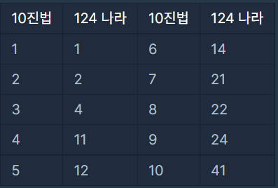 - 124 나라에는 모든 수를 표현할 때 1, 2, 4만 사용합니다.