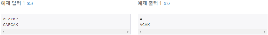LCS가 여러 가지인 경우에는 아무거나 출력하고, LCS의 길이가 0인 경우에는 둘째 줄을 출력하지 않는다.