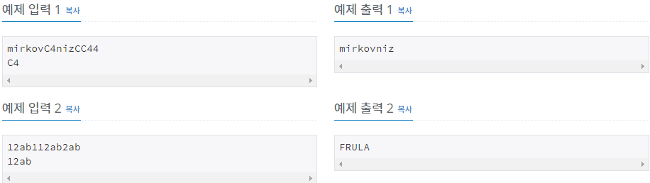첫째 줄에 문자열이 주어진다. 문자열의 길이는 1보다 크거나 같고, 1,000,000보다 작거나 같다. 둘째 줄에 폭발 문자열이 주어진다. 길이는 1보다 크거나 같고, 36보다 작거나 같다. 두 문자열은 모