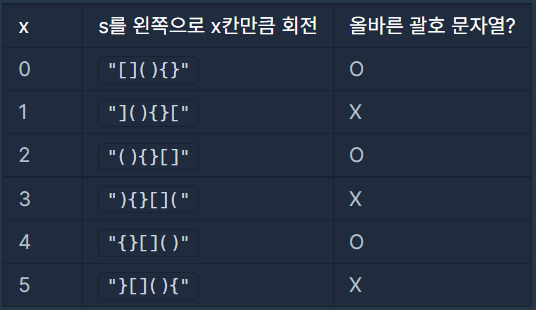 대괄호, 중괄호, 그리고 소괄호로 이루어진 문자열 s가 매개변수로 주어집니다. 이 s를 왼쪽으로 x (0 ≤ x < (s의 길이)) 칸만큼 회전시켰을 때 s가 올바른 괄호 문자열이 되게 하는 x의 개수를 return 하도록 solution 함수를 완성해주세요.