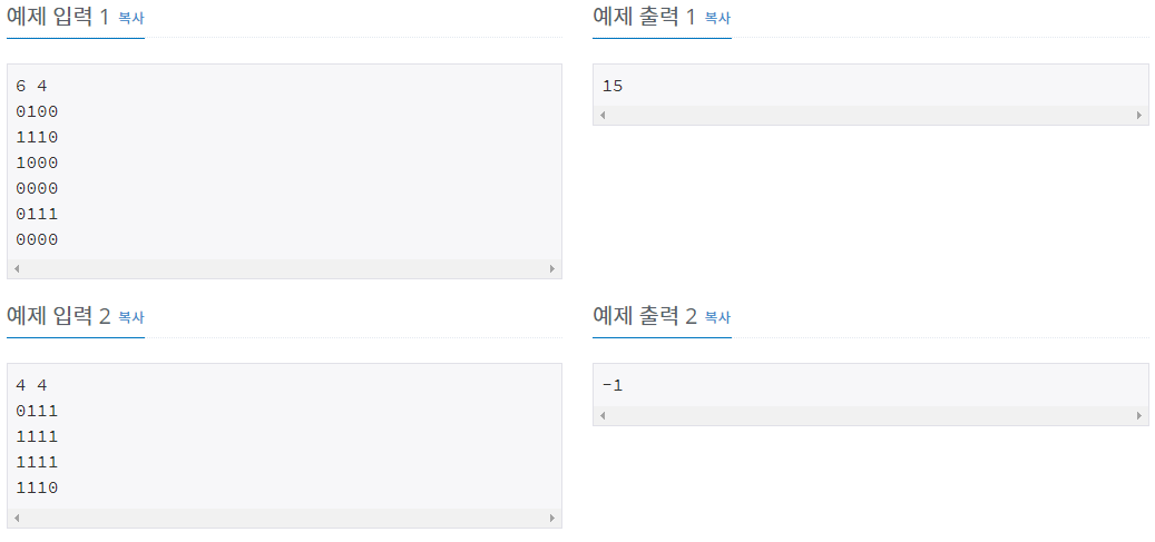 첫째 줄에 N(1 ≤ N ≤ 1,000), M(1 ≤ M ≤ 1,000)이 주어진다. 다음 N개의 줄에 M개의 숫자로 맵이 주어진다. (1, 1)과 (N, M)은 항상 0이라고 가정하자.