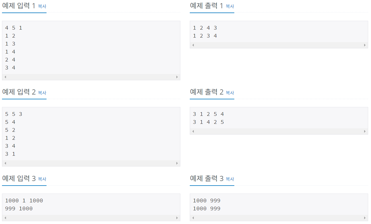 첫째 줄에 정점의 개수 N(1 ≤ N ≤ 1,000), 간선의 개수 M(1 ≤ M ≤ 10,000), 탐색을 시작할 정점의 번호 V가 주어진다. 다음 M개의 줄에는 간선이 연결하는 두 정점의 번호가 주어진다. 어떤 두 정점 사이에 여러 개의 간선이 있을 수 있다. 입력으로 주어지는 간선은 양방향이다.