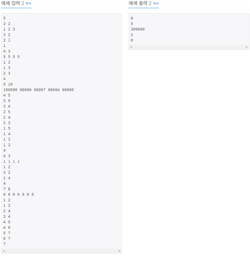 첫째 줄에는 테스트케이스의 개수 T가 주어진다. 각 테스트 케이스는 다음과 같이 주어진다. 첫째 줄에 건물의 개수 N 과 건물간의 건설순서규칙의 총 개수 K이 주어진다. (건물의 번호는 1번부터 N번까지 존재한다)