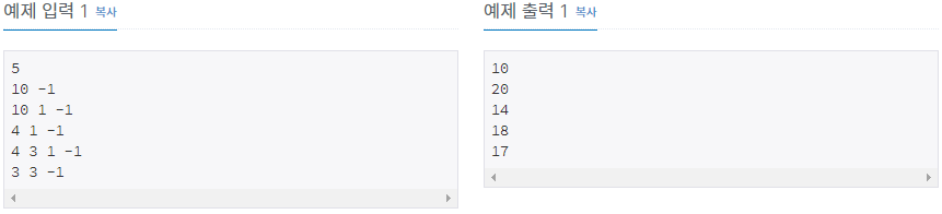 첫째 줄에 건물의 종류 수 N(1 ≤ N ≤ 500)이 주어진다. 다음 N개의 줄에는 각 건물을 짓는데 걸리는 시간과 그 건물을 짓기 위해 먼저 지어져야 하는 건물들의 번호가 주어진다. 건물의 번호는 1부터 N까지로 하고, 각 줄은 -1로 끝난다고 하자. 각 건물을 짓는데 걸리는 시간은 100,000보다 작거나 같은 자연수이다.