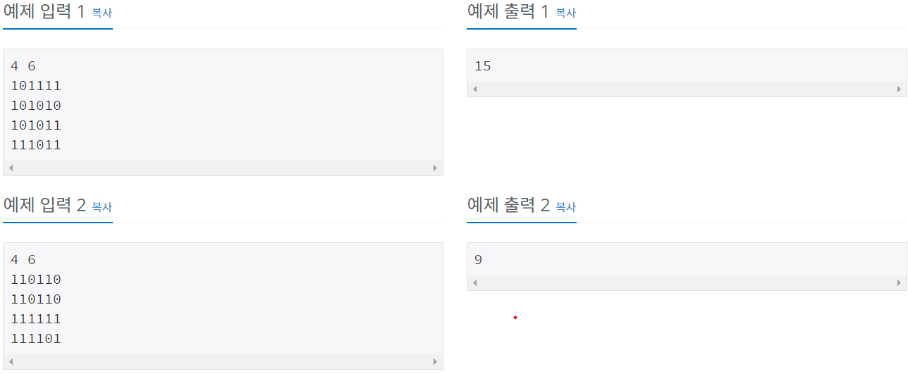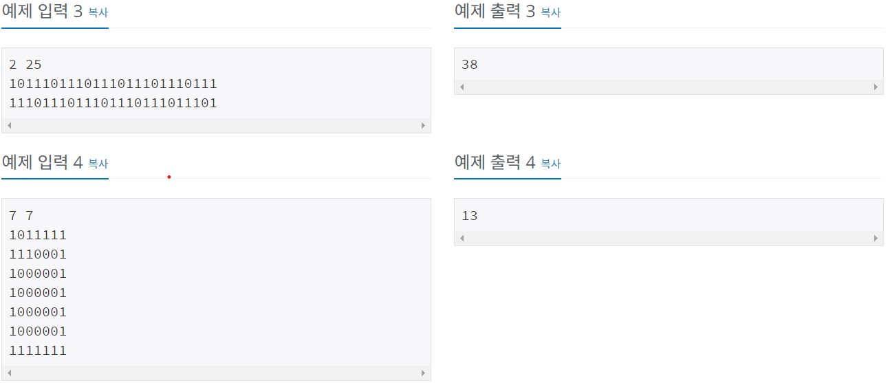 첫째 줄에 두 정수 N, M(2 ≤ N, M ≤ 100)이 주어진다. 다음 N개의 줄에는 M개의 정수로 미로가 주어진다. 각각의 수들은 붙어서 입력으로 주어진다.