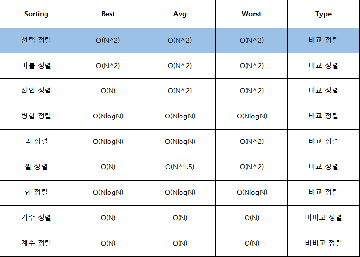 4. 시간 복잡도는 최선, 평균, 최악의 경우 모두 O(N^2)로 비효율적인 정렬 방법이다.