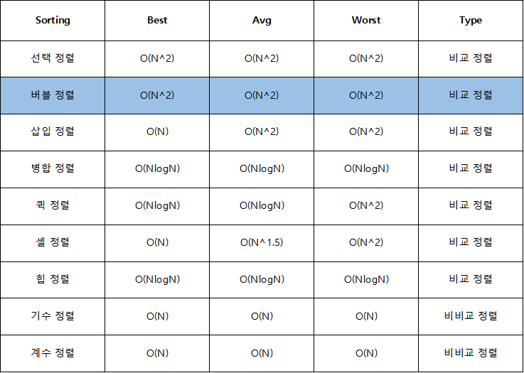 4. 시간 복잡도는 최선, 평균, 최악의 경우 모두 O(N^2)이며 모든 정렬 중에 가장 비효율적인 정렬 방법이다.