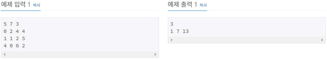 첫째 줄에 M과 N, 그리고 K가 빈칸을 사이에 두고 차례로 주어진다. M, N, K는 모두 100 이하의 자연수이다. 둘째 줄부터 K개의 줄에는 한 줄에 하나씩 직사각형의 왼쪽 아래 꼭짓점의 x, y좌표값과 오