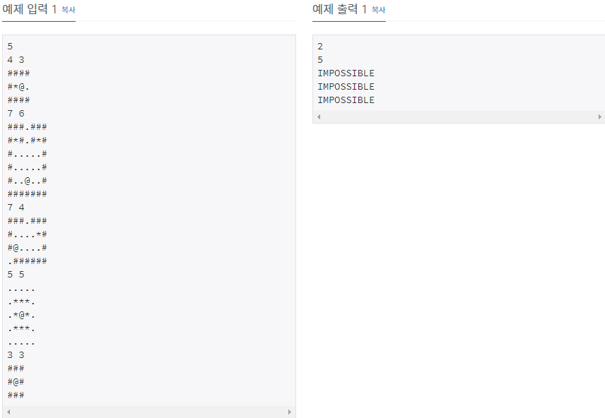 각 테스트 케이스마다 빌딩을 탈출하는데 가장 빠른 시간을 출력한다. 빌딩을 탈출할 수 없는 경우에는 "IMPOSSIBLE"을 출력한다.