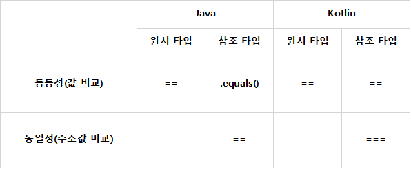 Kotlin의 ===는 Java의 참조타입의 동일성을 비교하는 ==와 동일하다.