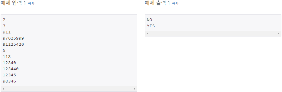 전화번호 목록이 주어진다. 이때, 이 목록이 일관성이 있는지 없는지를 구하는 프로그램을 작성하시오.