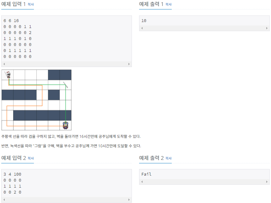 만약 용사가 공주를 T시간 이내에 구출할 수 없다면, "Fail"을 출력한다.