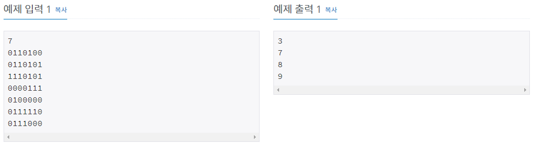 <그림 1>과 같이 정사각형 모양의 지도가 있다. 1은 집이 있는 곳을, 0은 집이 없는 곳을 나타낸다. 철수는 이 지도를 가지고 연결된 집의 모임인 단지를 정의하고, 단지에 번호를 붙이려 한다. 여기서 연결되었다는 것은 어떤 집이 좌우, 혹은 아래위로 다른 집이 있는 경우를 말한다. 대각선상에 집이 있는 경우는 연결된 것이 아니다. <그림 2>는 <그림 1>을 단지별로 번호를 붙인 것이다. 지도를 입력하여 단지수를 출력하고, 각 단지에 속하는 집의 수를 오름차순으로 정렬하여 출력하는 프로그램을 작성하시오.