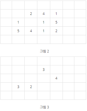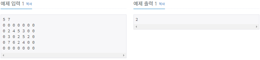 지구 온난화로 인하여 북극의 빙산이 녹고 있다. 빙산을 그림 1과 같이 2차원 배열에 표시한다고 하자. 빙산의 각 부분별 높이 정보는 배열의 각 칸에 양의 정수로 저장된다. 빙산 이외의 바다에 해당되는 칸에는 0이 저장된다. 그림 1에서 빈칸은 모두 0으로 채워져 있다고 생각한다.