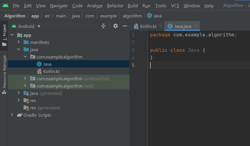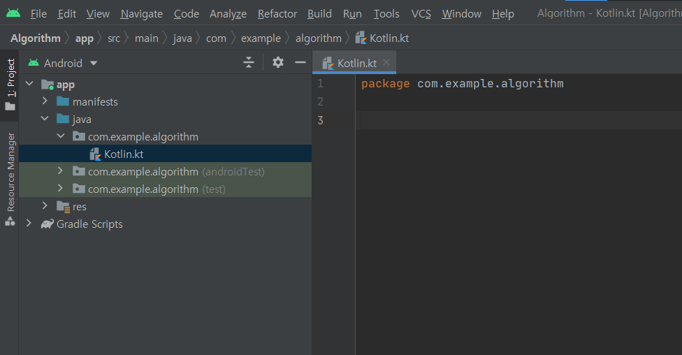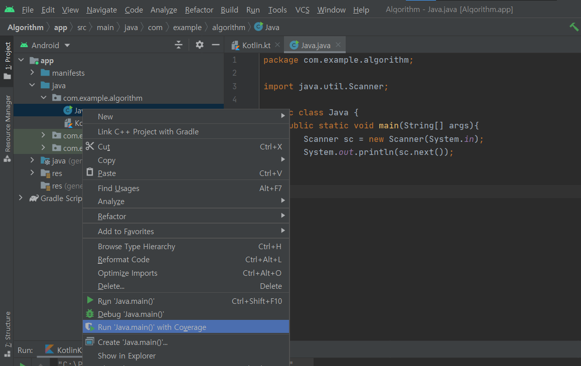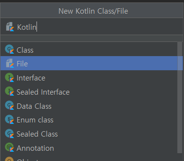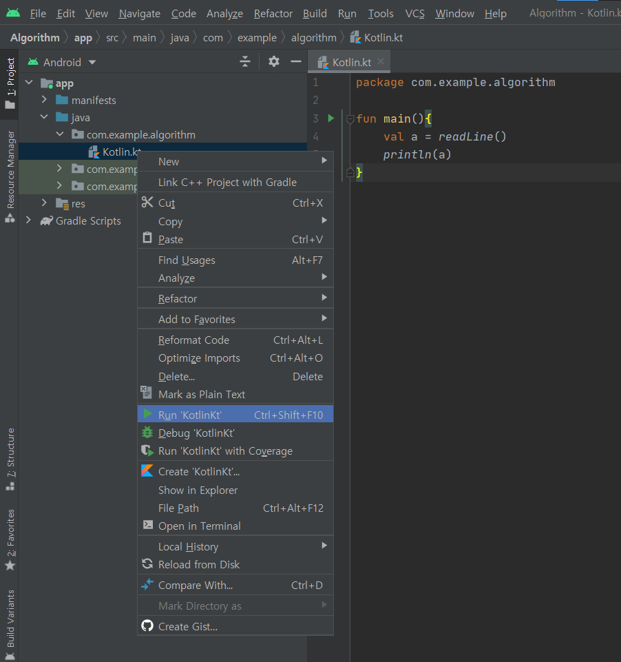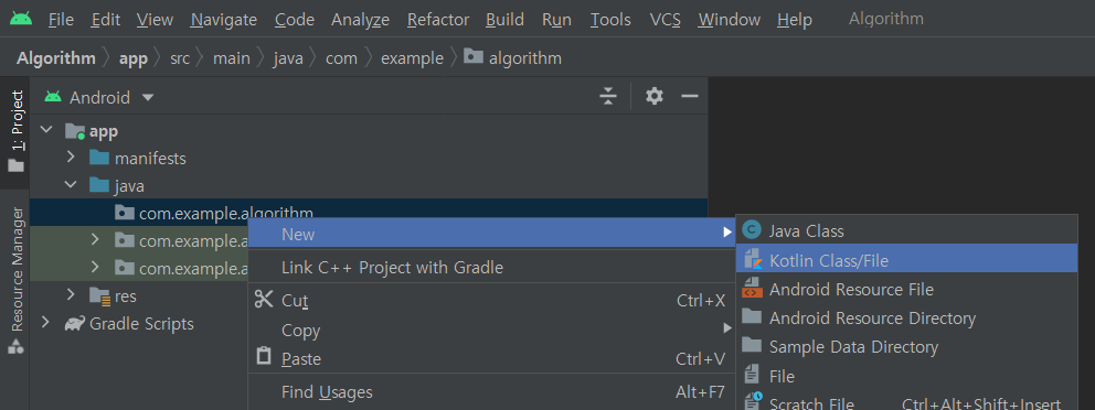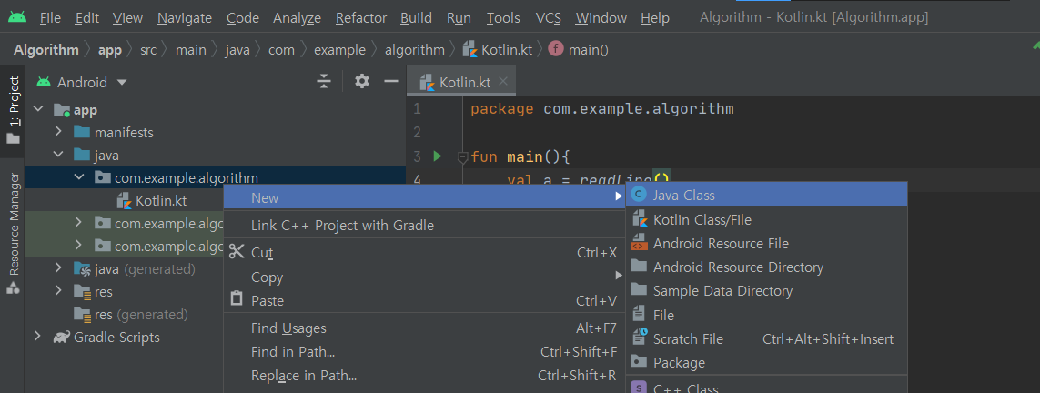 java-> com.example.algorithm폴더를 우클릭 후 New-> Kotlin Class/File을 클릭