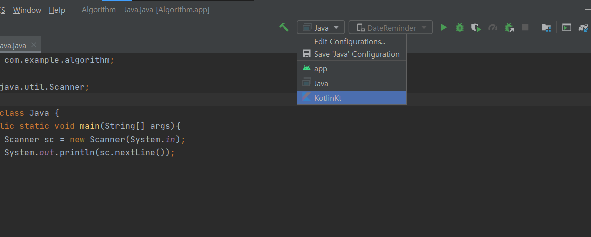 13. 이후 화면 우측 상단에 추가된 Java,KotlinKt을 선택하여 재생 버튼을 누르면 빠르게 실행할 수 있다.