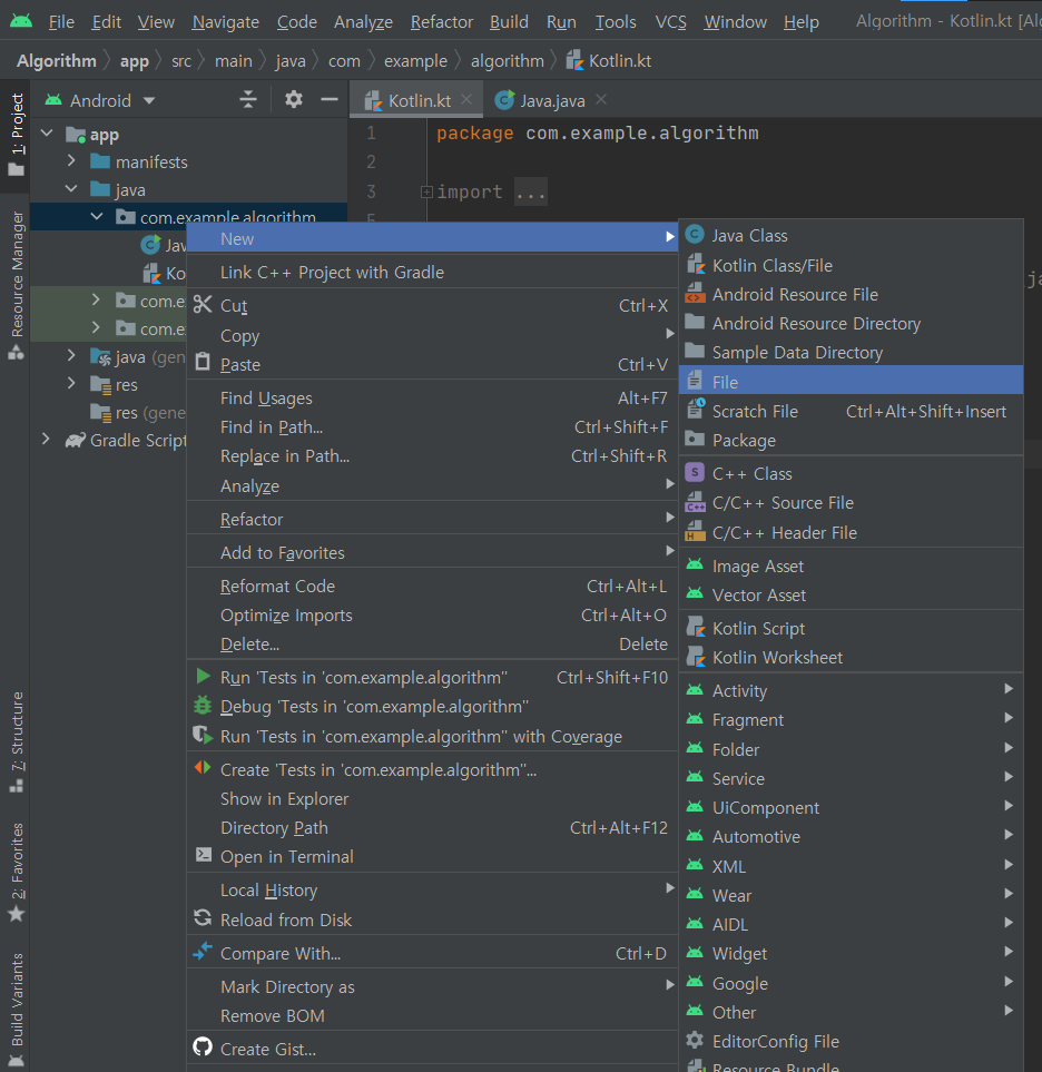 java-> com.example.algorithm폴더를 우클릭 후 File을 클릭