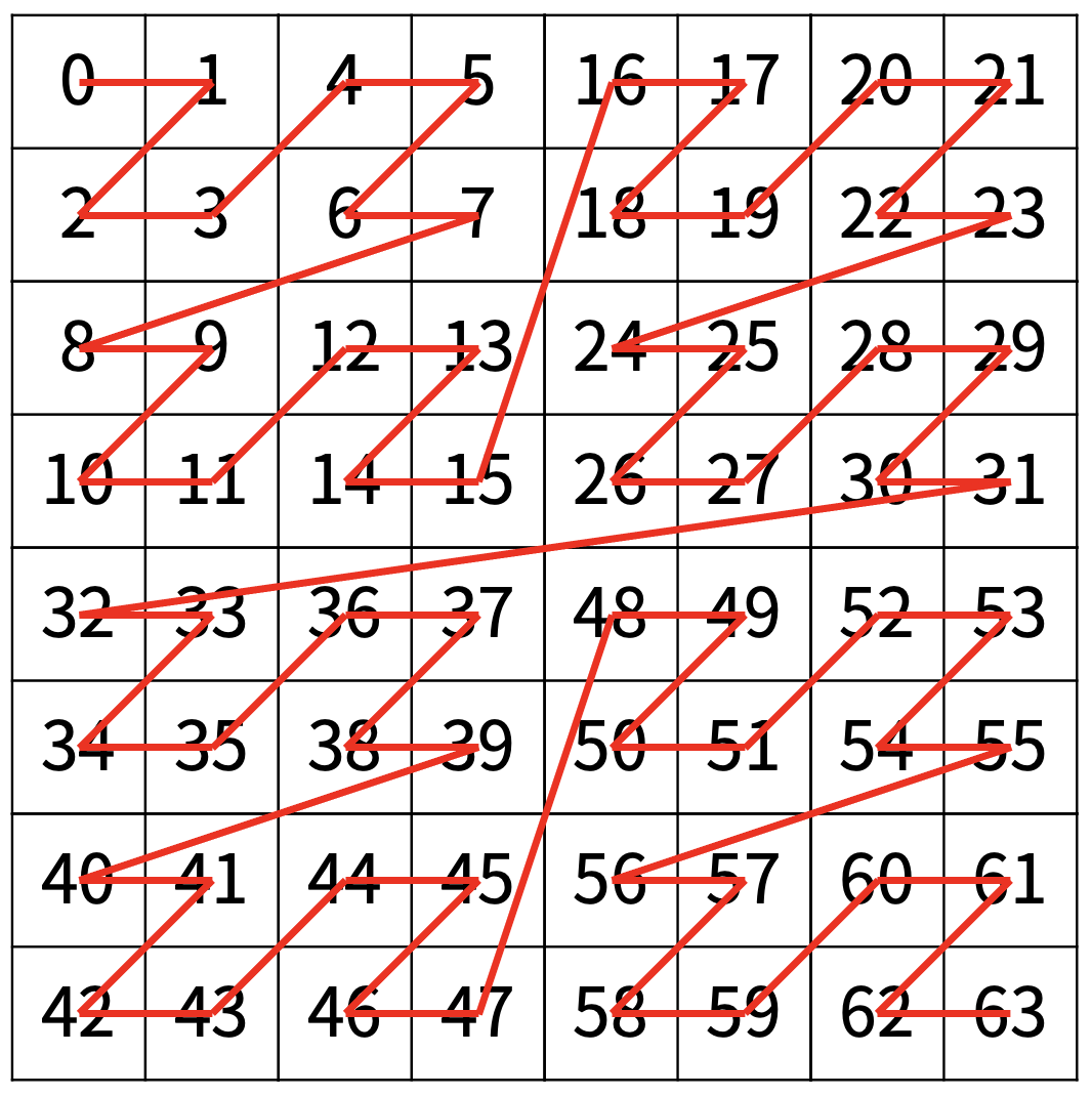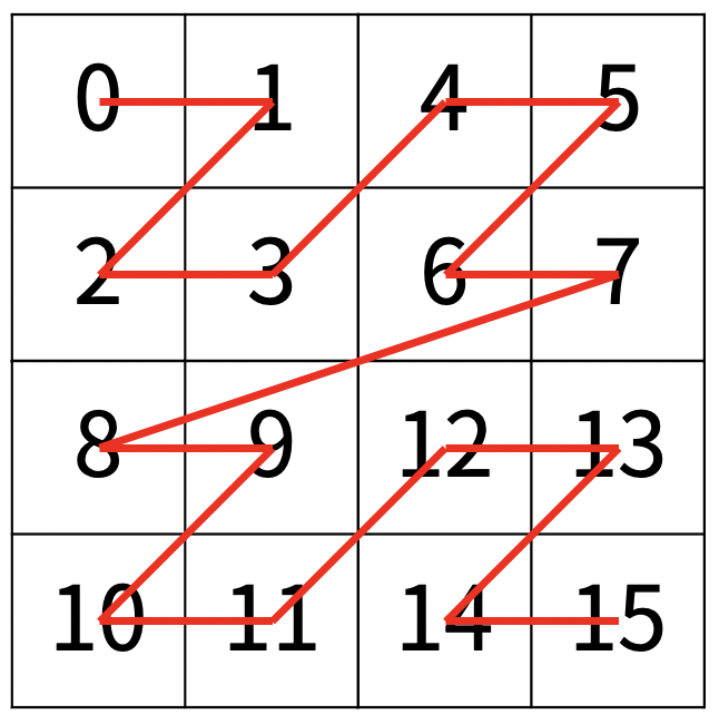 만약, N > 1이 라서 왼쪽 위에 있는 칸이 하나가 아니라면, 배열을 크기가 2N-1 × 2N-1로 4등분 한 후에 재귀적으로 순서대로 방문한다.