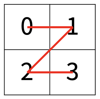한수는 크기가 2N × 2N인 2차원 배열을 Z모양으로 탐색하려고 한다. 예를 들어, 2×2배열을 왼쪽 위칸, 오른쪽 위칸, 왼쪽 아래칸, 오른쪽 아래칸 순서대로 방문하면 Z모양이다. 만약, N > 1이 라서