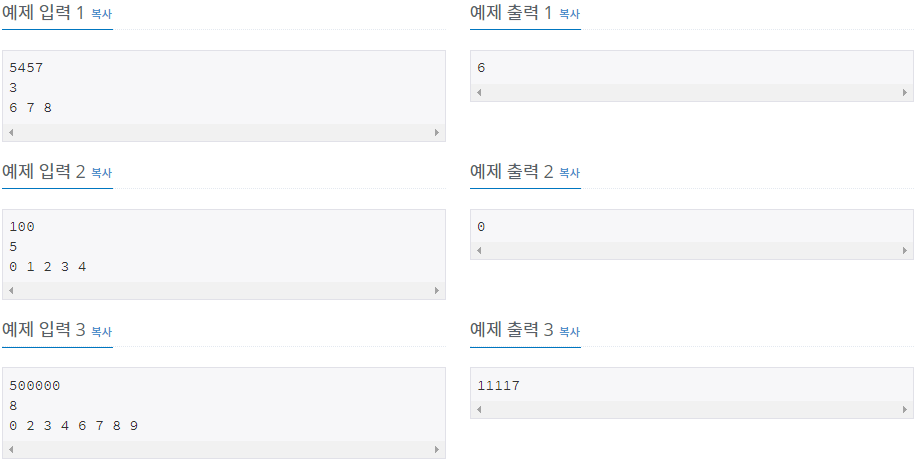 첫째 줄에 수빈이가 이동하려고 하는 채널 N (0 ≤ N ≤ 500,000)이 주어진다. 둘째 줄에는 고장난 버튼의 개수 M (0 ≤ M ≤ 10)이 주어진다. 고장난 버튼이 있는 경우에는 셋째 줄에는 고장난 버튼이 주어지며, 같은 버튼이 여러 번 주어지는 경우는 없다.