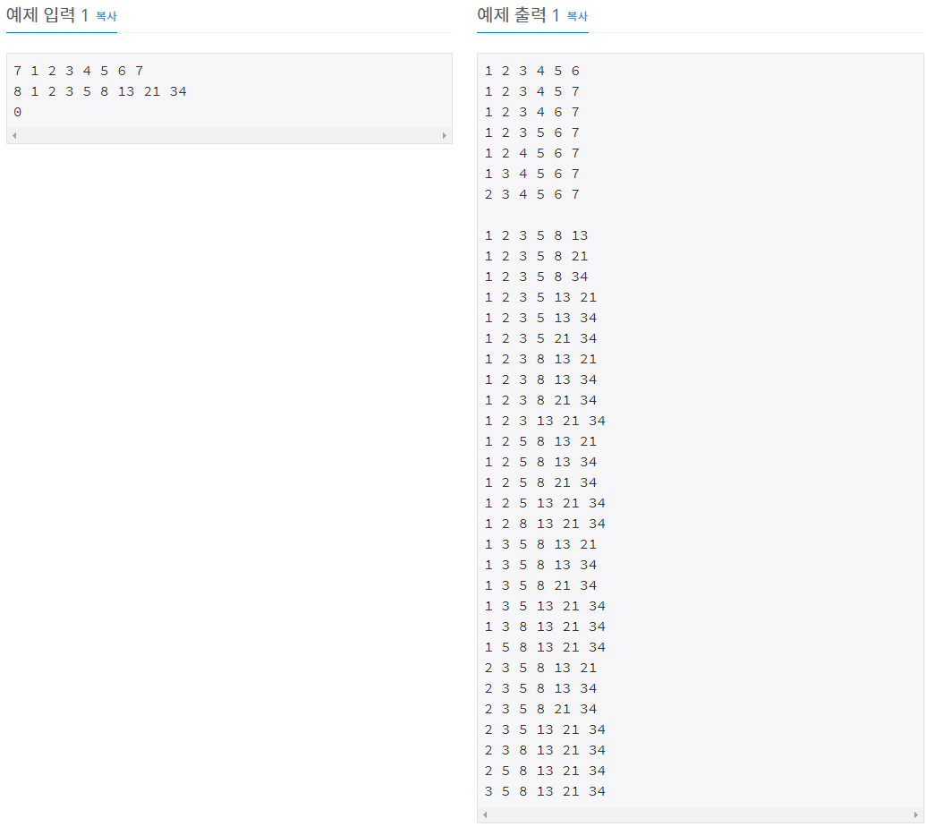 입력은 여러 개의 테스트 케이스로 이루어져 있다. 각 테스트 케이스는 한 줄로 이루어져 있다. 첫 번째 수는 k (6 < k < 13)이고, 다음 k개 수는 집합 S에 포함되는 수이다. S의 원소는 오름차순으로 주어진다.