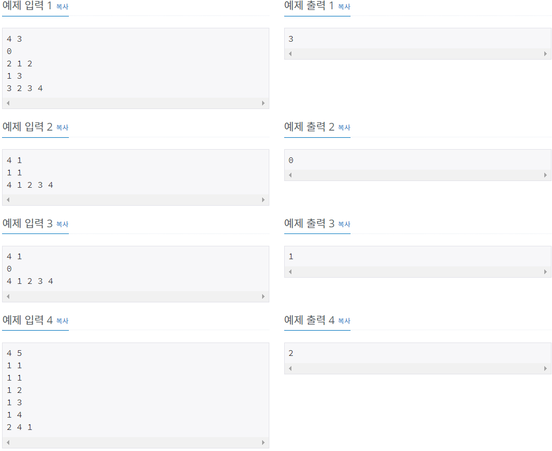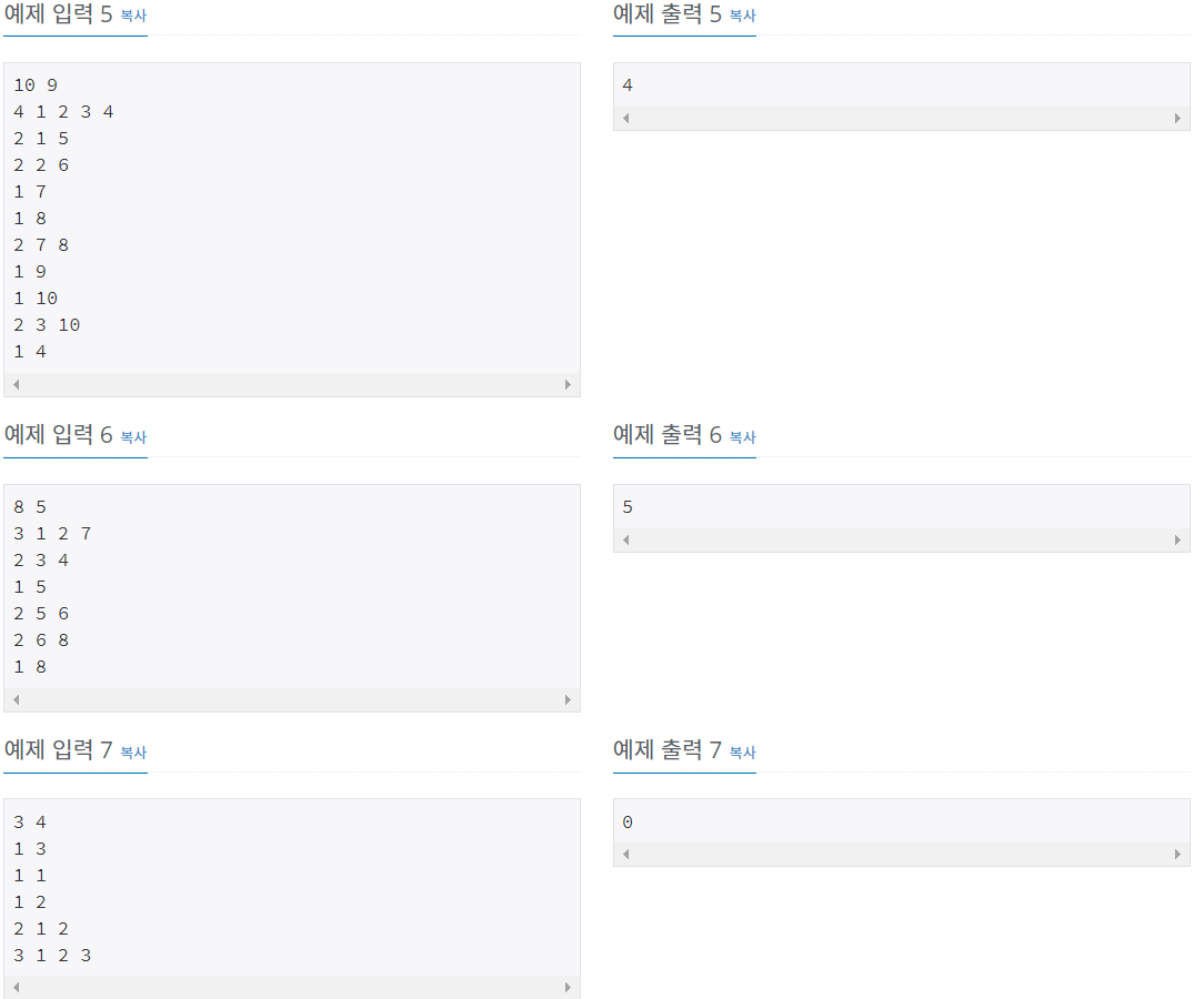 셋째 줄부터 M개의 줄에는 각 파티마다 오는 사람의 수와 번호가 같은 방식으로 주어진다.
