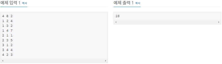 첫째 줄에 N(1 ≤ N ≤ 1,000), M(1 ≤ M ≤ 10,000), X가 공백으로 구분되어 입력된다. 두 번째 줄부터 M+1번째 줄까지 i번째 도로의 시작점, 끝점, 그리고 이 도로를 지나는데 필요한 소요시간 Ti가 들어