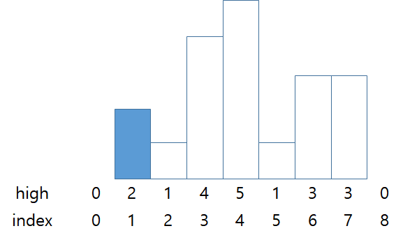 초기에 스택에 0을 넣어놓고, 2는 0보다 높기 때문에 스택에 높이2인 막대의 인덱스를 push한다.