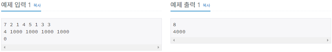 입력은 테스트 케이스 여러 개로 이루어져 있다. 각 테스트 케이스는 한 줄로 이루어져 있고, 직사각형의 수 n이 가장 처음으로 주어진다. (1 ≤ n ≤ 100,000) 그 다음 n개의 정수 h1, ..., hn (0 ≤ hi ≤ 1,000,000,000)가 주어진다. 이 숫자들은 히스토그램에 있는 직사각형의 높이이며, 왼쪽부터 오른쪽까지 순서대로 주어진다. 모든 직사각형의 너비는 1이고, 입력의 마지막 줄에는 0이 하나 주어진다.