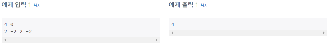첫째 줄에 정수 N과 K가 주어진다. (1 ≤ N ≤ 200,000, |K| ≤ 2,000,000,000) N과 K 사이에는 빈칸이 하나 있다. 둘째 줄에는 배열 A를 이루는 N개의 정수가 빈 칸을 사이에 두고 A[1], A[2], ..., A[N]의 순서로 주어진다. 주어지는 정수의 절댓값은 10,000을 넘지 않는다.