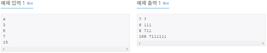 각 테스트 케이스에 대해서 입력으로 주어진 성냥개비를 모두 사용해서 만들 수 있는 가장 작은 수와 가장 큰 수를 출력한다. 두 숫자는 모두 양수이어야 하고, 숫자는 0으로 시작할 수 없다.
