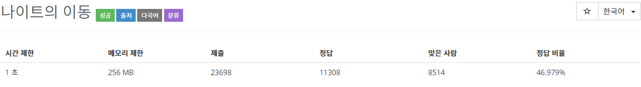 체스판 위에 한 나이트가 놓여져 있다. 나이트가 한 번에 이동할 수 있는 칸은 아래 그림에 나와있다. 나이트가 이동하려고 하는 칸이 주어진다. 나이트는 몇 번 움직이면 이 칸으로 이동할 수 있을까?