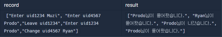 채팅방에 들어오고 나가거나, 닉네임을 변경한 기록이 담긴 문자열 배열 record가 매개변수로 주어질 때, 모든 기록이 처리된 후, 최종적으로 방을 개설한 사람이 보게 되는 메시지를 문자열 배열 형태로 return 하도록 solution 함수를 완성하라.