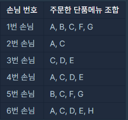 예를 들어, 손님 6명이 주문한 단품메뉴들의 조합이 다음과 같다면,