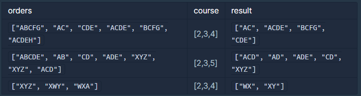 - orders와 course 매개변수는 return 하는 배열의 길이가 1 이상이 되도록 주어집니다.