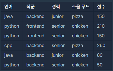 인재영입팀에 근무하고 있는 니니즈는 코딩테스트 결과를 분석하여 채용에 참여한 개발팀들에 제공하기 위해 지원자들의 지원 조건을 선택하면 해당 조건에 맞는 지원자가 몇 명인 지 쉽게 알 수 있는 도구를 만들고 있습니다.