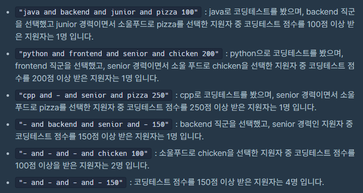 - 예를 들면, "cpp and - and senior and pizza 500"은 "cpp로 코딩테스트를 봤으며, 경력은 senior 이면서 소울푸드로 pizza를 선택한 지원자 중 코딩테스트 점수를 500점 이상 받은 사람은 모두 몇 명인가?"를 의미합니다.