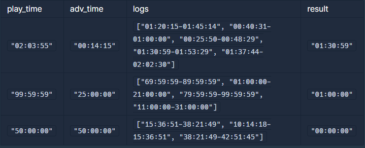 - 초록색으로 표시된 구간(69:59:59-94:59:59)에 광고를 삽입해도 동일한 결과를 얻을 수 있으나, 01:00:00이 69:59:59 보다 빠른 시각이므로, "01:00:00"을 return 합니다.