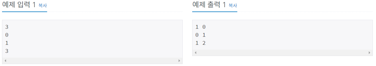 각 테스트 케이스마다 0이 출력되는 횟수와 1이 출력되는 횟수를 공백으로 구분해서 출력한다.