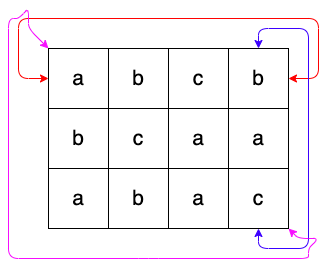 - 이 세상은 N행 M열의 격자로 생겼으며, 각 칸에 알파벳이 써있고 환형으로 이어진다. 왼쪽 위를 (1, 1), 오른쪽 아래를 (N, M)이라고 하자.