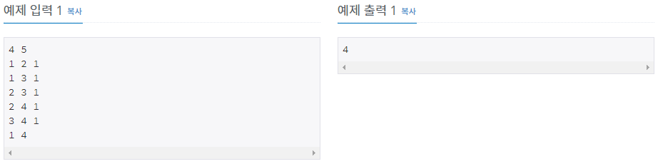 첫 번째 줄에는 정점의 개수 N과 두 정점 사이를 잇는 도로의 개수 M이 공백으로 구분되어 주어진다.