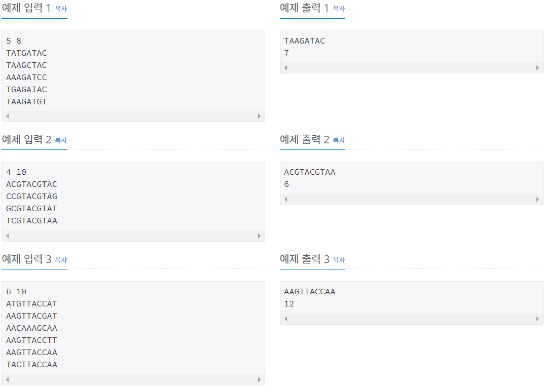 첫 줄에 DNA의 수 N과 문자열의 길이 M이 주어진다. 그리고 둘째 줄부터 N+1번째 줄까지 N개의 DNA가 주어진다. N은 1,000보다 작거나 같은 자연수이고, M은 50보다 작거나 같은 자연수이다.
