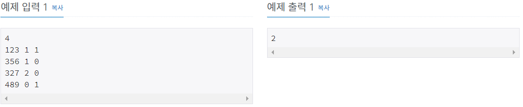 첫째 줄에는 민혁이가 영수에게 몇 번이나 질문을 했는지를 나타내는 1 이상 100 이하의 자연수 N이 주어진다. 이어지는 N개의 줄에는 각 줄마다 민혁이가 질문한 세 자리 수와 영수가 답한 스트라이크 개수를 나타내는 정수와 볼의 개수를 나타내는 정수, 이렇게 총 세 개의 정수가 빈칸을 사이에 두고 주어진다.