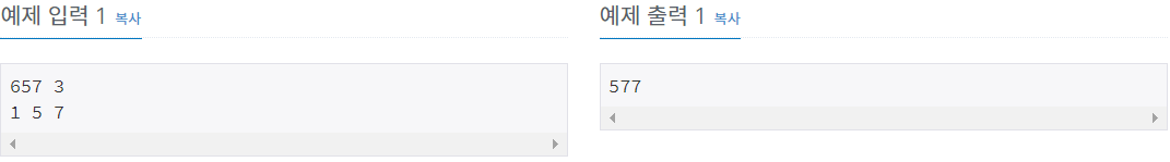 첫째 줄에 N, K의 원소의 개수가 공백을 기준으로 구분되어 자연수로 주어진다. (10 ≤ N ≤ 100,000,000, 1 ≤ K의 원소의 개수 ≤ 3) 둘째 줄에 K의 원소들이 공백을 기준으로 구분되어 주어진다. 각 원소는 1부터 9까지의 자연수다.