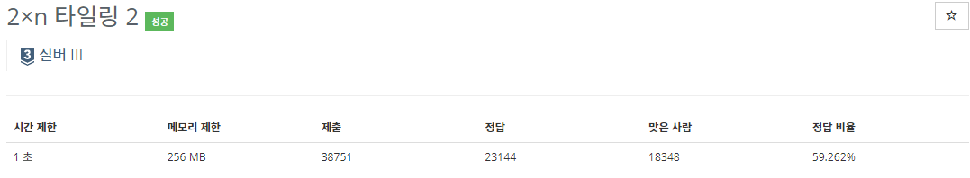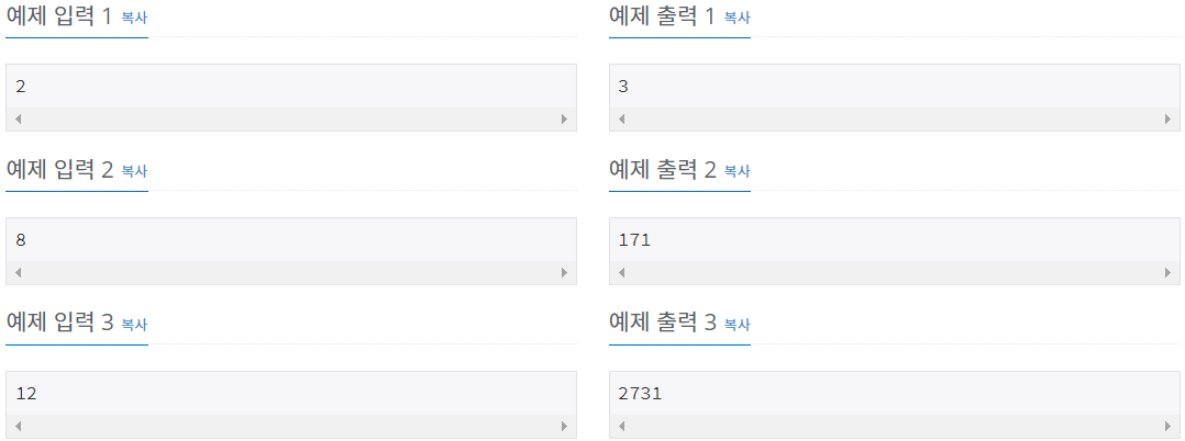2×n 직사각형을 1×2, 2×1과 2×2 타일로 채우는 방법의 수를 구하는 프로그램을 작성하시오.
