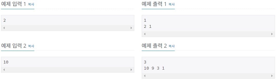 둘째 줄에는 N을 1로 만드는 방법에 포함되어 있는 수를 공백으로 구분해서 순서대로 출력한다. 정답이 여러 가지인 경우에는 아무거나 출력한다.