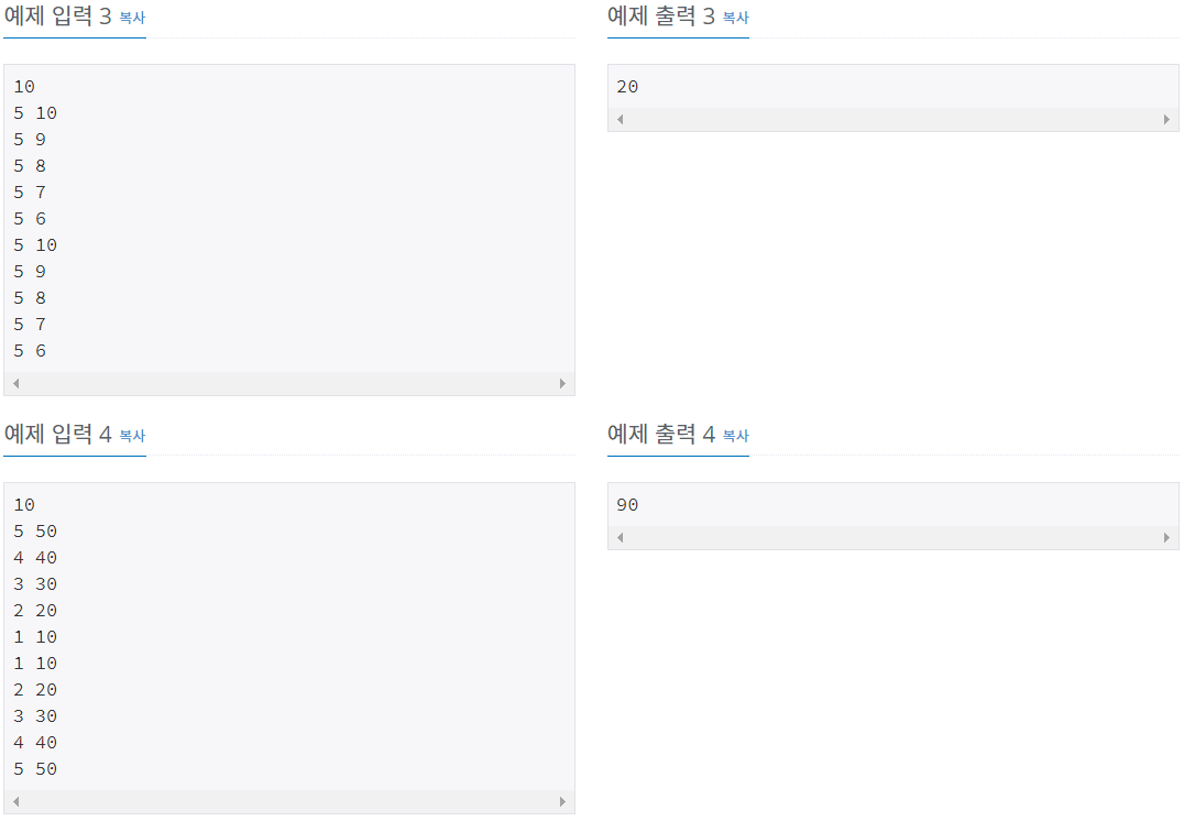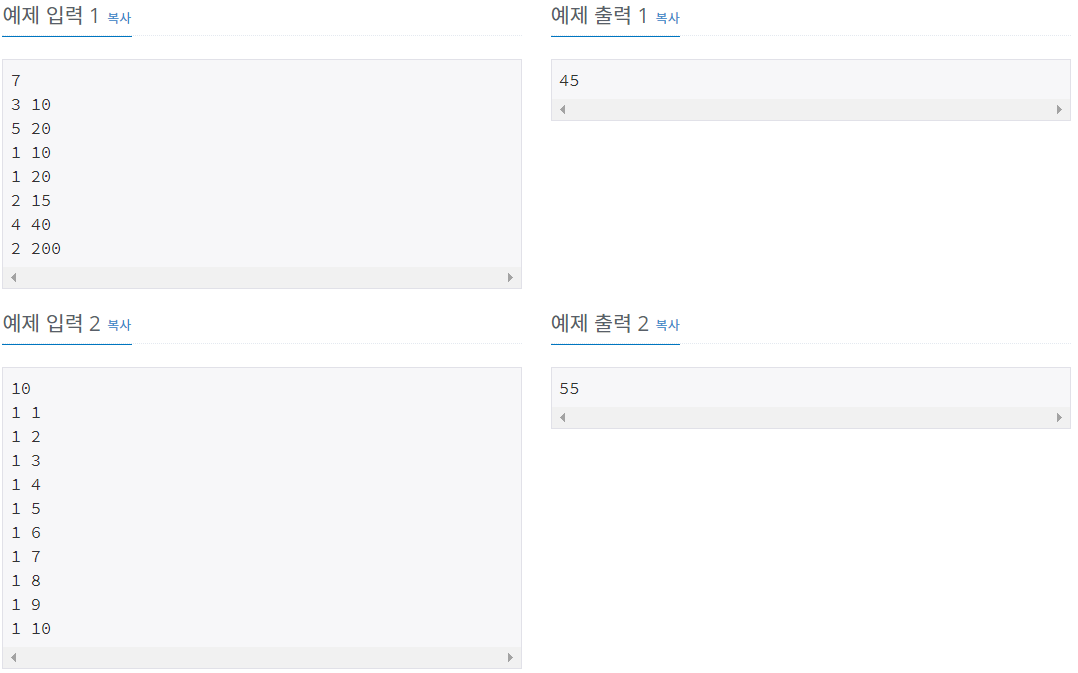 둘째 줄부터 N개의 줄에 Ti와 Pi가 공백으로 구분되어서 주어지며, 1일부터 N일까지 순서대로 주어진다. (1 ≤ Ti ≤ 5, 1 ≤ Pi ≤ 1,000)