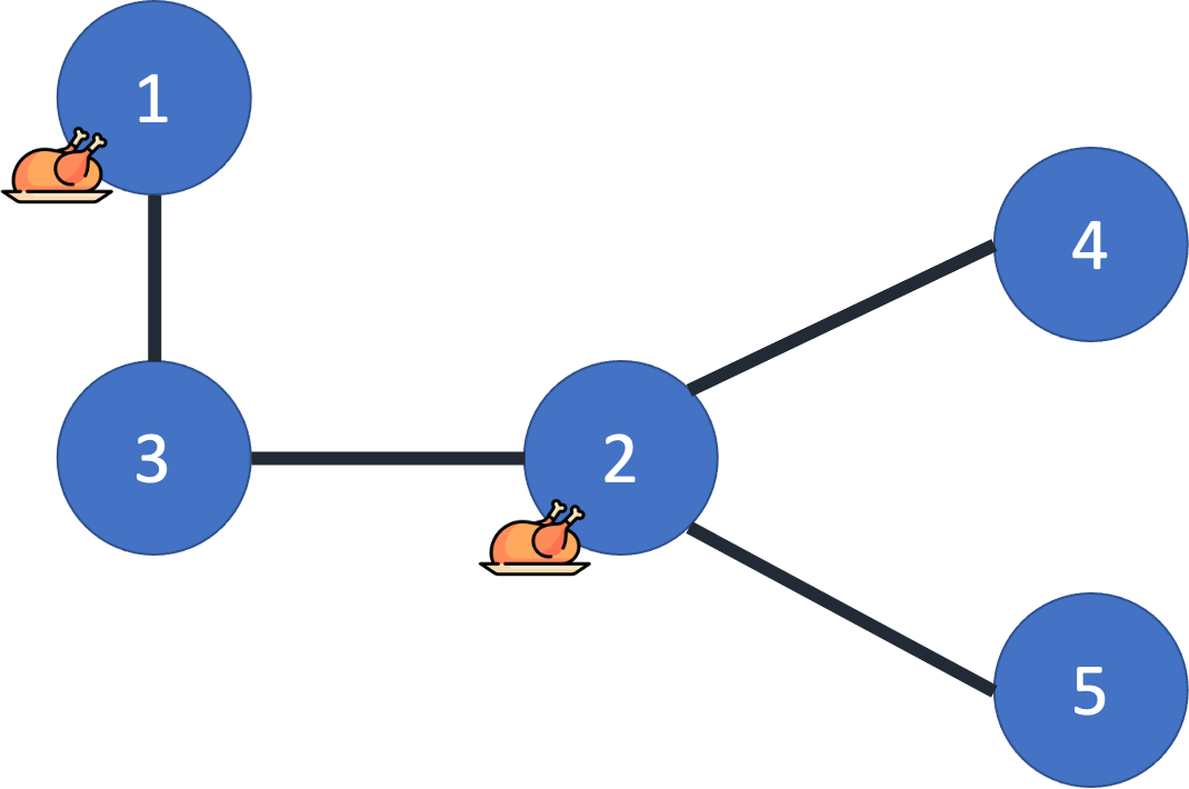 위의 그림과 같이 1번과 2번 건물에 치킨집을 짓게 되면 1번부터 5번 건물에 대해 치킨집까지의 왕복 시간이 0, 0, 2, 2, 2 로 최소가 된다. 2번과 3번 건물에 지어도 동일한 왕복 시간이 나오지만 더