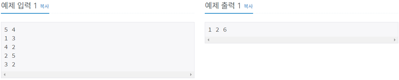 첫 번째 줄에 건물의 개수 N과 도로의 개수 M 이 주어진다. 이어서 M 개의 줄에 걸쳐서 도로의 정보 Ai , Bi 가 공백으로 나뉘어서 주어진다. 같은 도로가 중복되어 주어지는 경우는 없다. 어떤 두 건물을 잡아도 도로를 따라서 오고 가는 방법이 존재함이 보장된다.