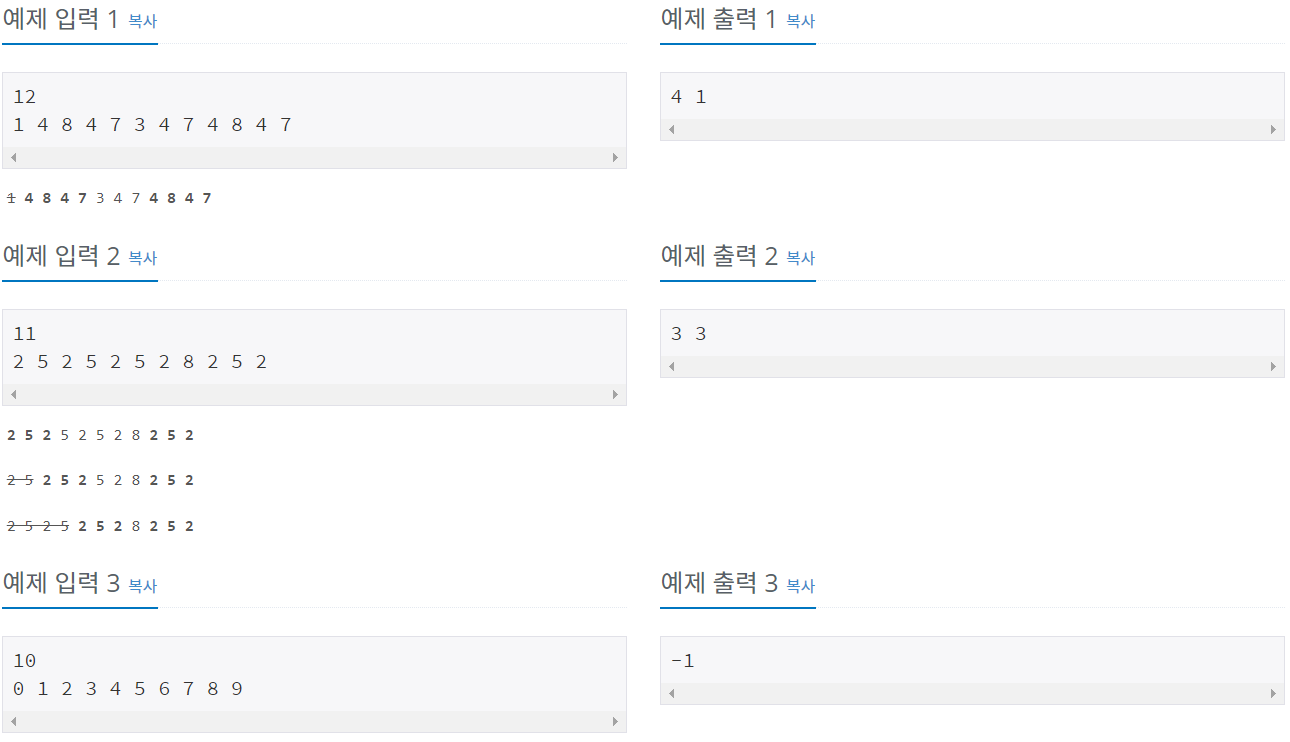 앞부분을 잘라서 앞뒤수열로 만들 수 있다면, 그렇게 자른 후 수열의 앞뒤계수 최댓값과 그렇게 자르는 방법의 수를 공백으로 구분하여 출력한다. 어떻게 잘라도 앞뒤계수가 존재하지 않으면 -1 을 출력한다.